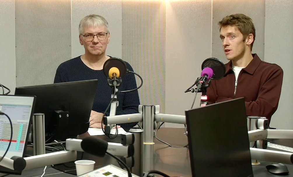 Hans Andrias Sølvará, professari í søgu, og Heini í Skorini, lektari í altjóða politikki, vóru í útvarpsstovuni.
